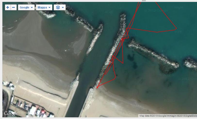 L’uscita dagli scogli non è stata facile perché il vento era direttamente sul muso, come si può notare dagli stretti angoli di bordeggio. Anche il manico si era un pochino arrugginito
