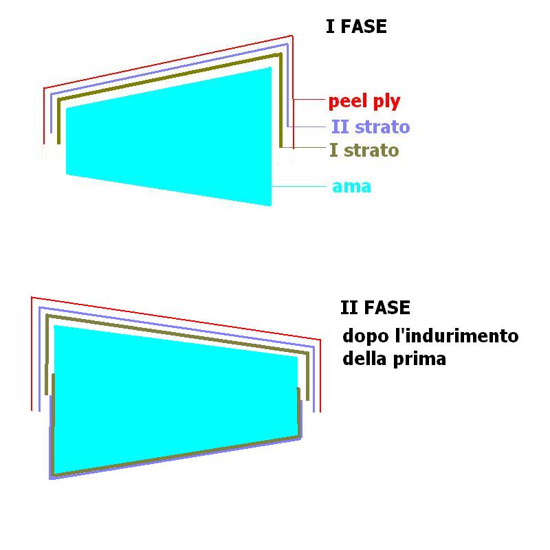 Come avevo già spiegato, l’idea iniziale era quella di realizzarlo mediante un telaietto in legno da rivestire in sandwich (anima in PVC 75 gr/mc da 10 mm, con pelli in tessuto biassiale 45° 300 gr/mq + Twill 90° 200 gr/mq). Ho preso in considerazione anche il metodo che sta usando Mario Falci (cuci e incolla con lastre in sandwich laminato in piano). Purtroppo ho difficoltà nel reperire il foam da 5 mm (introvabile qui da noi e difficile da farsi recapitare per corriere considerata la sua delicatezza, oltre ai tempi abbastanza lunghi), per cui dovrei restare con lo spessore da 10 mm, con il rischio, dato lo spessore, di avere problemi quando dovrà essere curvato per cucire le tre sagome.