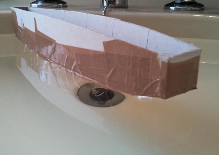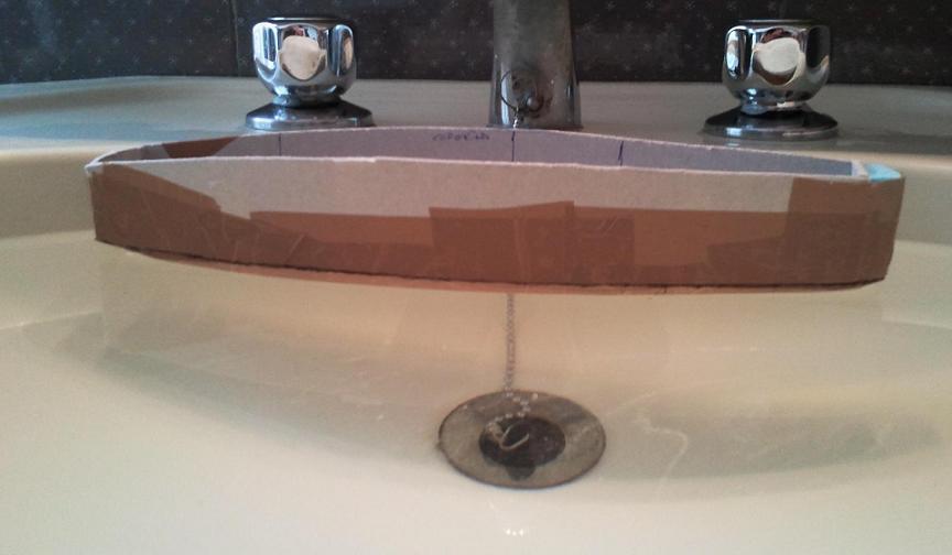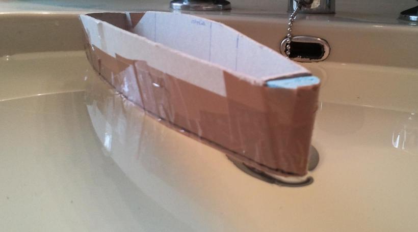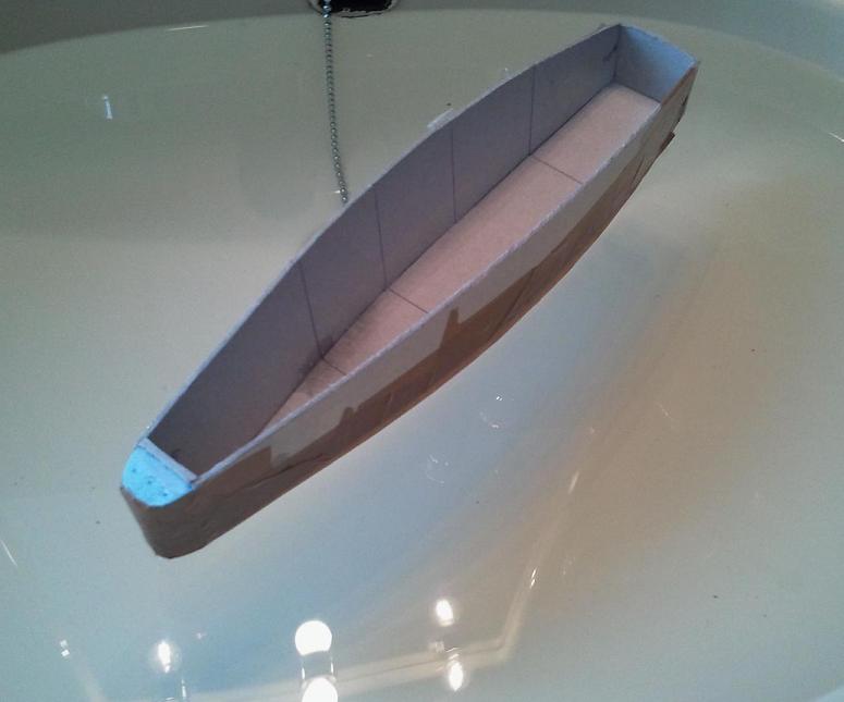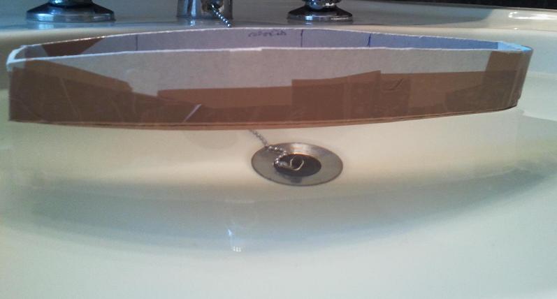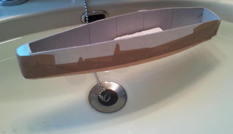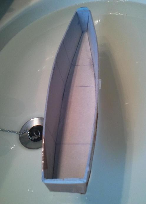 Prima di tagliare le sagome di compensato, ho realizzato un modellino di cartone dello scafo centrale per vedere se combinavano (avendo uno sviluppo diverso da quanto appare in pianta e in prospetto). Ho fatto anche una prova di galleggiamento per una grossolana verifica dell’assetto longitudinale (visto che i pesi non sono esattamente proporzionati a quelli reali).