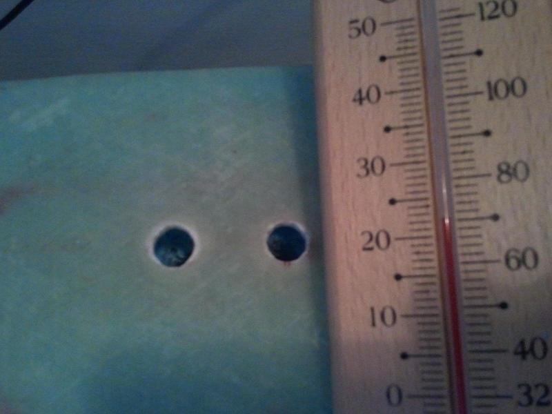 Tutto procedeva bene, e dopo circa un’ora e mezzo, quando la resina rimasta nel barattolo (lasciato vicino al foro) sembrava avesse raggiunto un livello di gelidificazione piuttosto elevato (ma, in realtà, forse sono stato fuorviato anche dall’aumento di viscosità dovuto alla bassa temperatura), decisi di orientare diversamente il getto d’aria e di alzare un po’ la temperatura, che era intanto scesa a circa 19° (temevo l’effetto contrario, cioè che una temperatura troppo bassa influisse negativamente sulla catalizzazione).