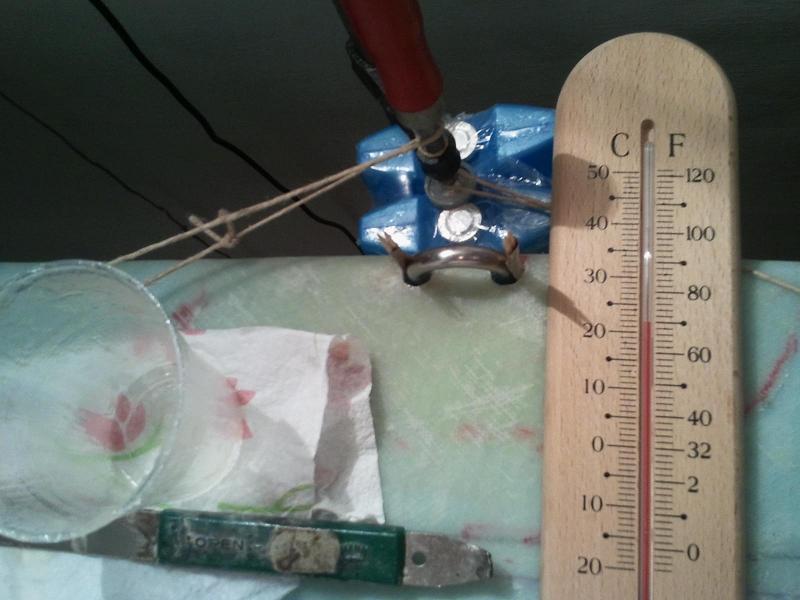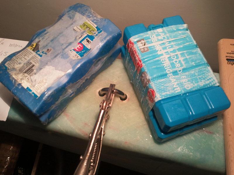 L’unica idea che mi era venuta in mente, per contenere la temperatura, è stata quella di attaccare alla parte esterna del golfare una pinza autobloccante (per assorbire un po’ di calore) e ricoprire il tutto con piastre congelate (quelle dei frigo portatili).