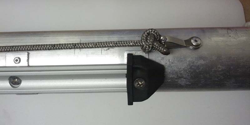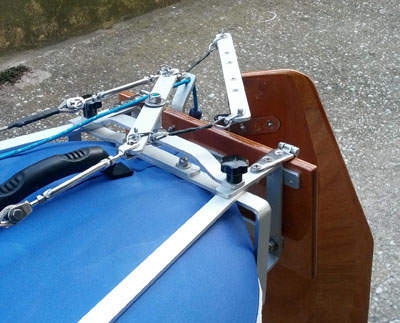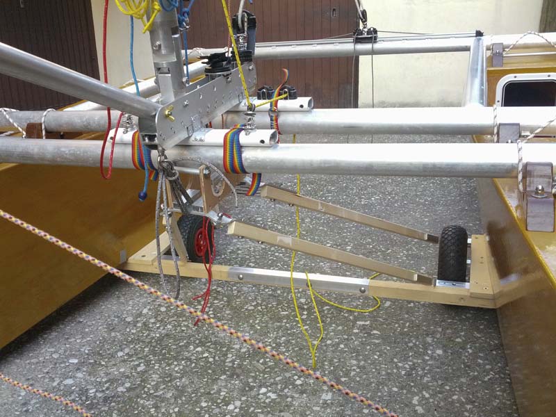 Intanto allora ho fatto un carrello classico. Contemporaneamente sposto l'attacco della scotta sul boma giusto sopra la traversa posteriore, dove fisserò la rotaia, così il circuito è più semplice.