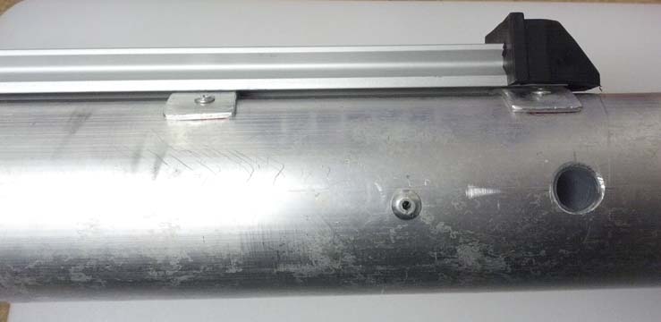 Sulla traversa, per fissare la rotaia, ho rivettato delle fettine ricavate da un avanzo di tubo. In questo modo il foro filettato su cui sono avvitate le viti ha uno spessore doppio, e resta una fessura sufficiente a passare le cinghie di fissaggio del trampolino.