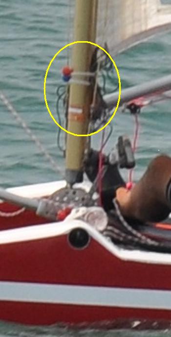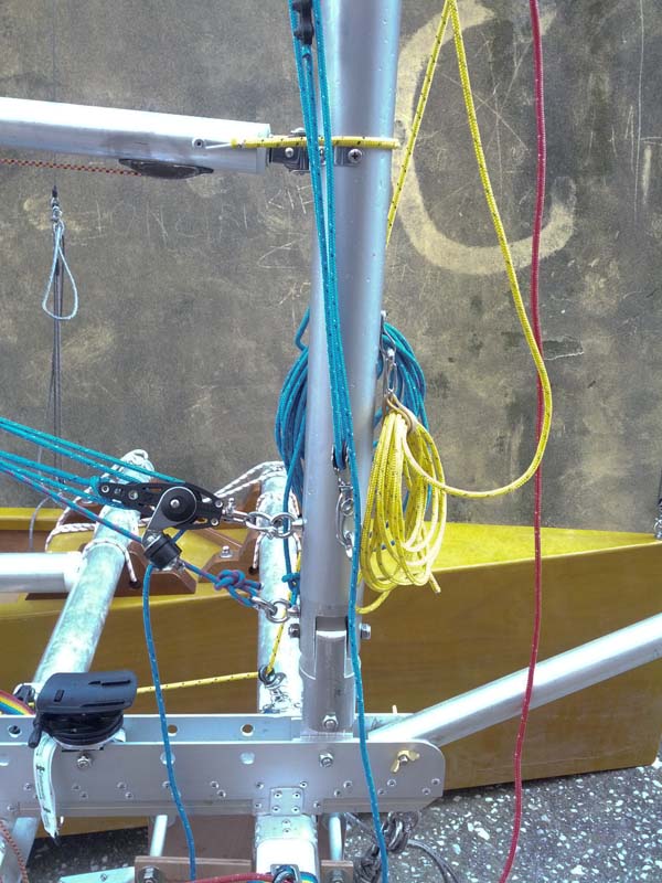 L'angolo del vang è troppo piccolo. Praticamente fletti il boma ma quasi tutto il carico lo deve sopportare in realtà l'albero che quindi si flette nella parte bassa. Basterebbe murare il vang alla base dell'albero, se vuoi anche utilizzando i fori della slitta.