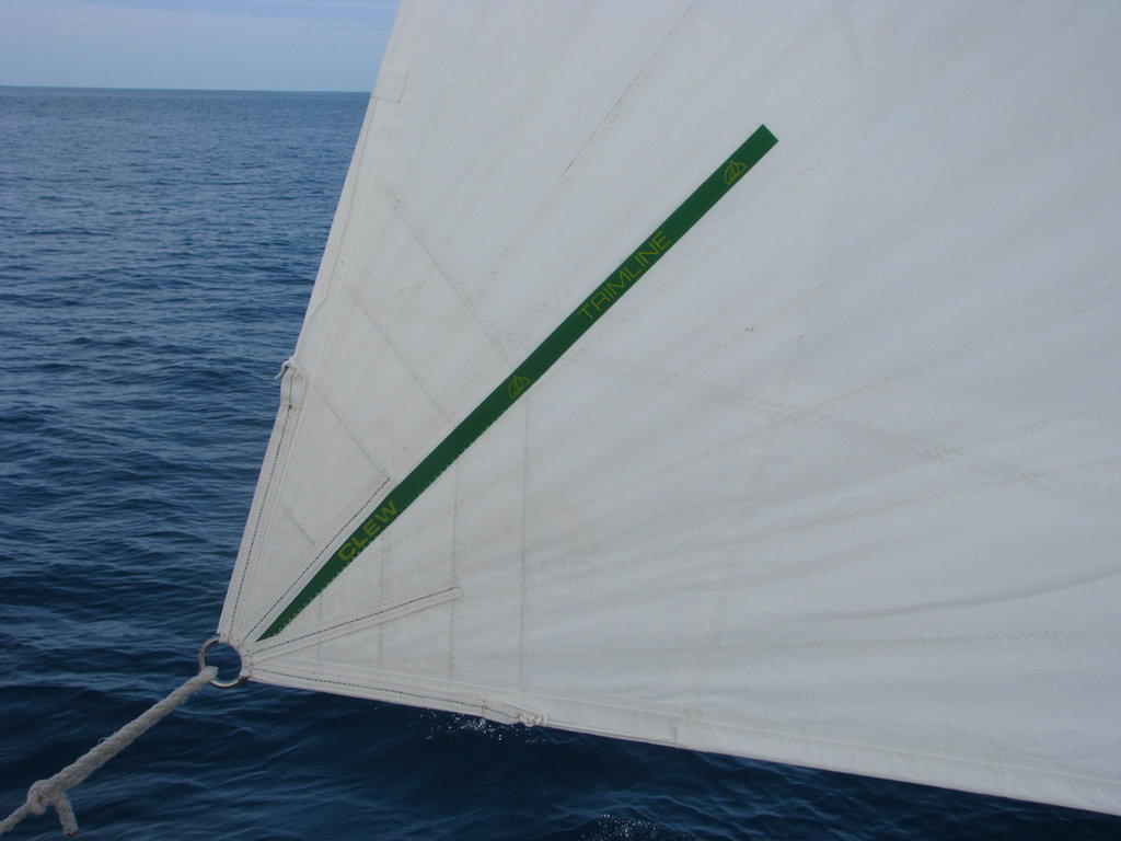 Notare il nastro adesivo che attraversa il fiocco, che parte dal punto mediano dell'inferitura ed arriva alla bugna, utilizzato per allineare correttamente le scotte spostando il punto di mura lungo il bompresso (che potrò anche accorciare).