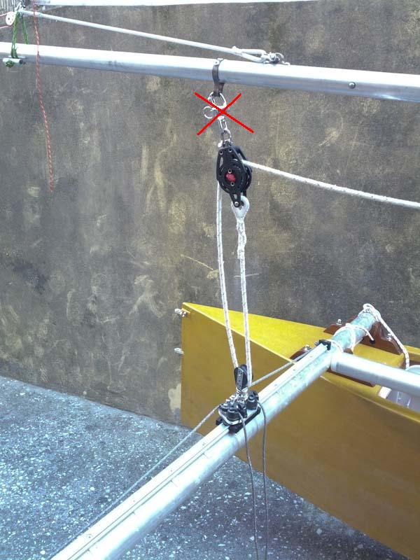 Abbassando il boma, la cima fissata alle due poppe che tiene il bozzello di rinvio della scotta è troppo lunga. Già accorciata.