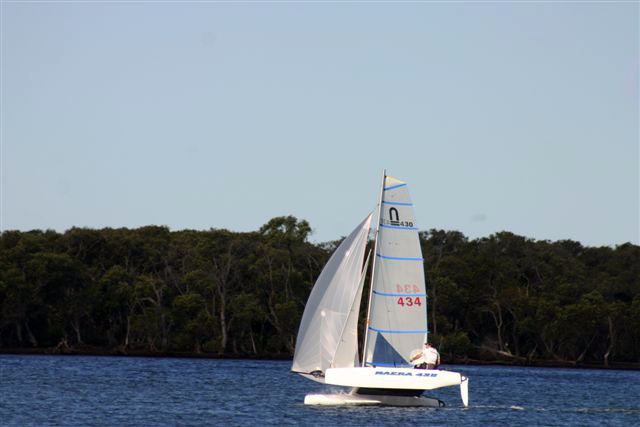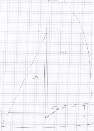 Ecco qua un'idea, non molto originale, lo ammetto, di catamarano adatto ad un equipaggio di due ragazzini, o anche di un adulto, che, penso, dovrebbe dare prestazioni abbastanza interessanti, anche se non estreme (la superficie velica resta un po' modesta)[/]