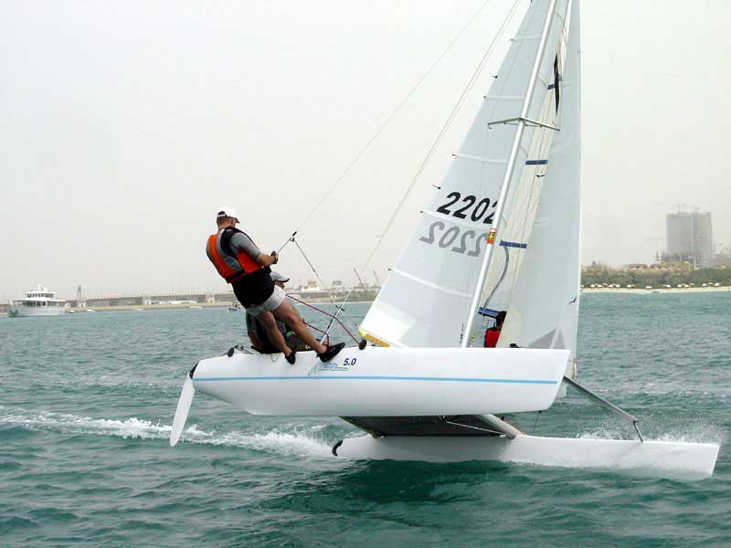 Interessante notare che la versione con scafi in vinilestere pesi 85 Kg, mentre quella in epossidica, di cui parla il blog che hai linkato, pesi ben 20-25 Kg in meno, che corrispondono a 1,30 mq in meno di PV base (9 randa e 2,70 Jib) e a 1 mq in meno di gennaker.