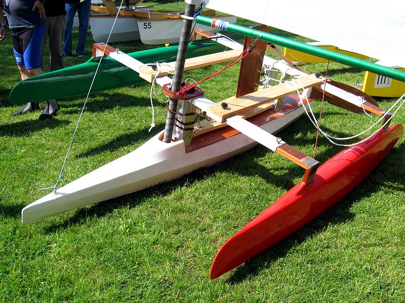 Da quanto ho capito, un trimarano sarebbe un monoscafo stabilizzato trasversalmente attraverso due galleggianti (amas) anziché un bulbo collocato chiglia. Gli scafi avrebbero quindi funzioni diverse e, pertanto, anche forme e dimensioni diverse. Poi in barche così piccole, da utilizzare per regatine brevi in acque protette, allora, rinunciando alle “comodità” di una barca (scafo centrale), potrebbe finire che i tre scafi si assomiglino parecchio.