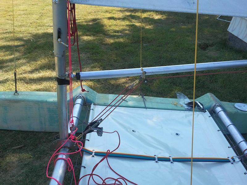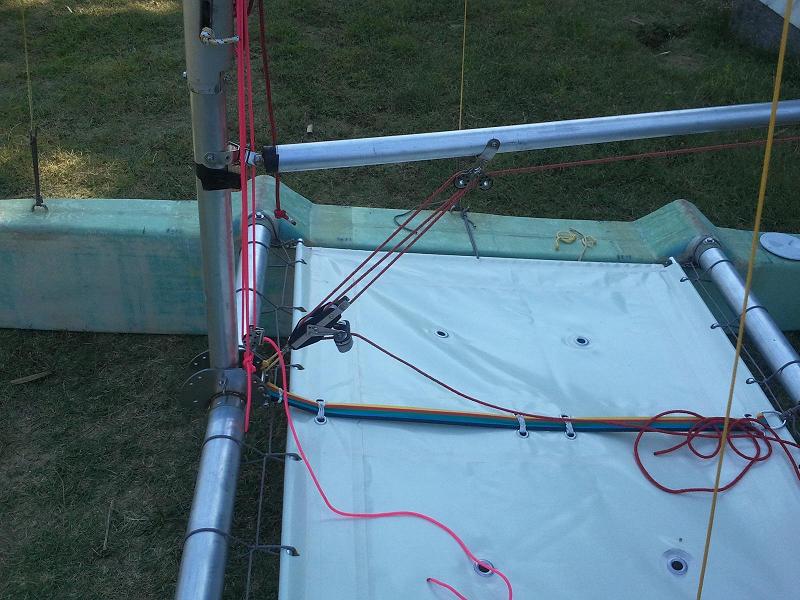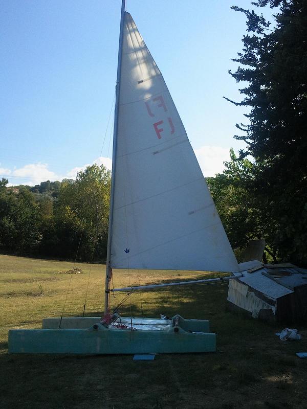 Armato con boma allungato alla “meno peggio”. Alla varea mancano ancora le pulegge dove scorrerà il tesabase. La randa è senza stecche causa rottura delle tasche che dovrò riparare