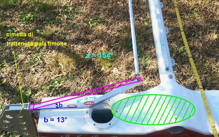 La mia esigenza primaria era tuttavia quella di recuperare più spazio possibile a poppavia della traversa (v. ovale verde) dove terminava la barra dritta. Ora posso spostarmi più indietro restando comunque seduto. Prima riuscivo ad arretrare all’incirca sulla posizione del metro giallo. Così dovrei aver recuperato intorno ai 25 cm che per 95 Kg di peso fanno un incremento del momento raddrizzante (in senso longitudinale) di circa 24 Kg.