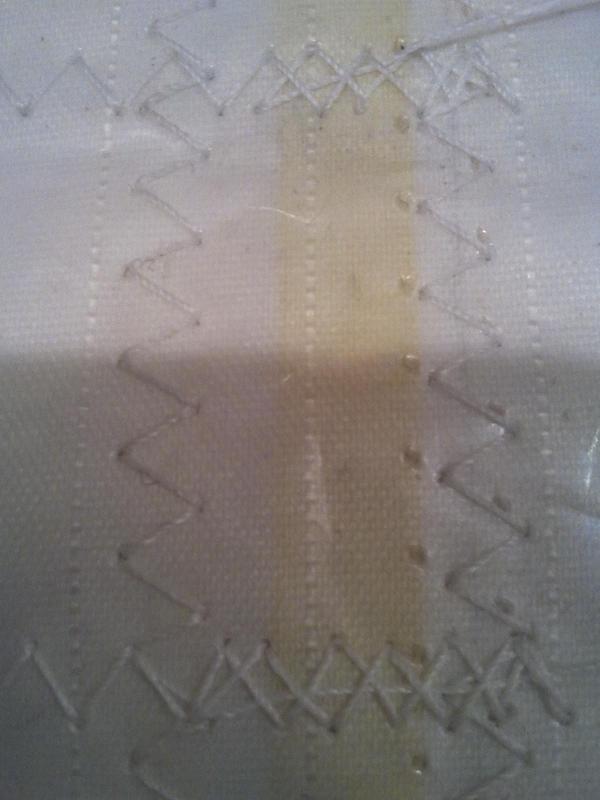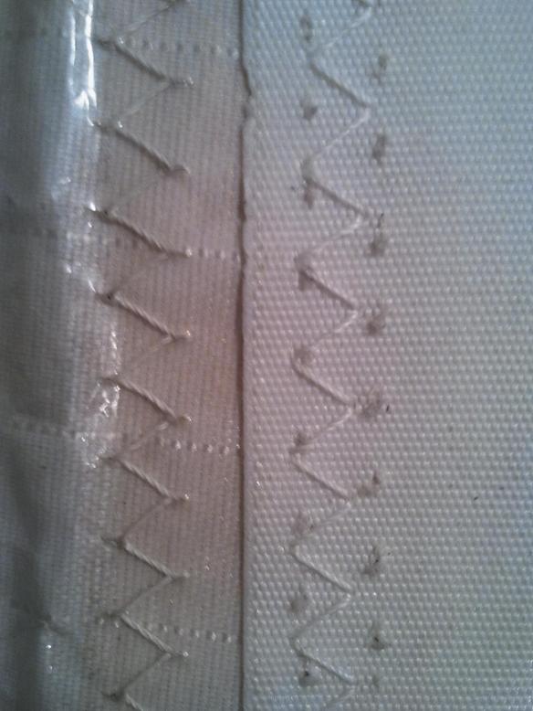 Nella foto che segue vedete (a sinistra) la cucitura originaria fatta dalla veleria e (a destra) quella rifatta da me sul nastro (guaina) che riveste l’inferitura, cercando di seguire i punti precedenti. Si distinguono anche dal filo (il mio è nuovo e più pulito  ).