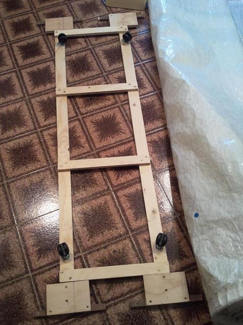 Per movimentare meglio la vela ho costruito un carrellino con rotelle snodate (€ 0.75 l’una). Legno, colla e viti le avevo già.