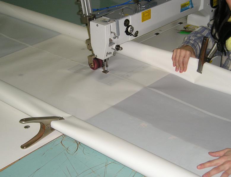 Lavorare sul pavimento aiuta, ma forse sarebbe stato meglio avere avuto un carrellino con ruote snodate, su cui appoggiare la randa avvolta e movimentarla più facilmente quando passava sotto l’ago. Le mie ginocchia e la mia schiena hanno però gradito poco questa tecnica