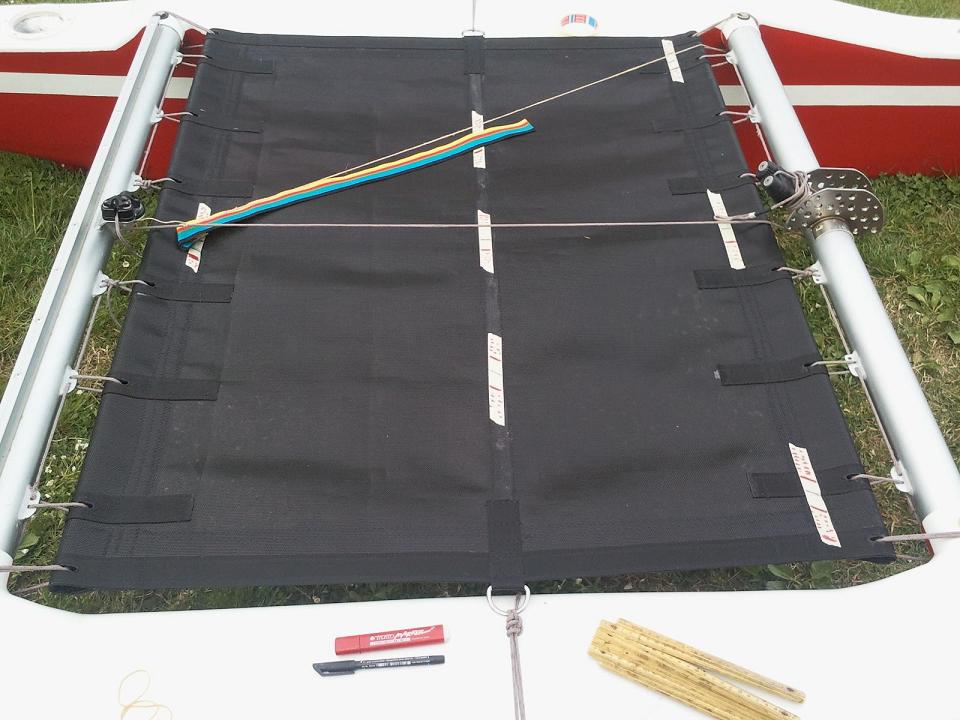 Comunque sto ragionando anche sul nuovo trampolino. Insieme al filo ed altri accessori per fare le vele, ho approfittato della spedizione per ordinare il tessuto di rete in polipropilene per catamarani che ho trovato ad un prezzo appena poco superiore al telo in PVC (da camion) che avevo usato per il trampolino attuale. Purtroppo l’avevano solo nero, ma dalle simulazioni non sembra male. Ovviamente ogni riferimento a colori calcistici è del tutto causale (per me una squadra vale l’altra).
