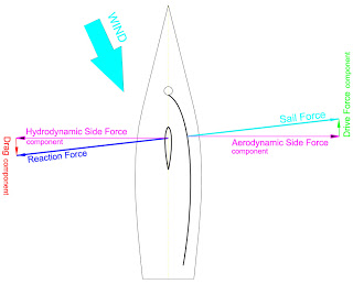 Forze agenti su un monoscafo di bolina. Come si vede ad ogni forza ne corrisponde una uguale e contraria. La forza generata dalla vela (Sail Force) è contrastata dalla portanza generata dalla deriva (Reaction Force). Se queste due forze sono allineate, come nel disegno, la barca avrà un comportamento neutro (non poggero e non orziero).