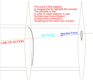 Per allineare la Sail Force e la Reaction Force, e avere quindi un comportamento neutro della barca, occorre spostare in avanti la deriva. Nella realtà bisogna considerare anche la resistenza dei timoni e degli scafi, per cui la deriva alla fine dovrà essere portata ancora più avanti rispetto al punto teorico indicato nel disegno.