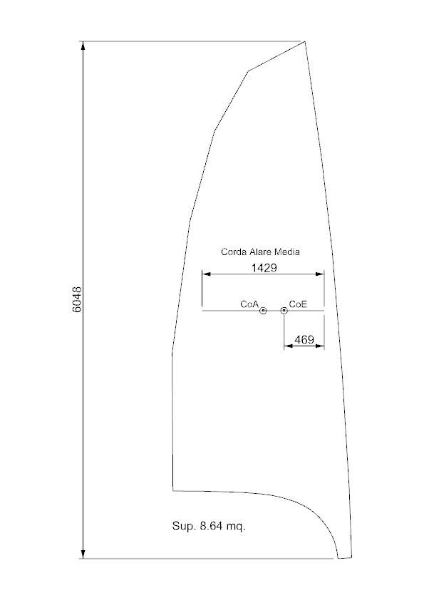 Quanto al CV Dinamico: ho scritto 25% della corda media alare perché solitamente nei calcoli degli aeromobili si assume quel valore, ma da una verifica fatta sul disegno della randa dei 29er direi che in questo caso invece è circa il 33%. Infatti 469 mm è circa il 33% di 1429 mm. Per calcolare la corda media basta dividere la superficie per l'altezza della vela. Io ho posizionato la corda media a cavallo del Centro Velico Statico, cioè il centroide geometrico della superficie della vela (CoA), metà a destra e metà a sinistra.