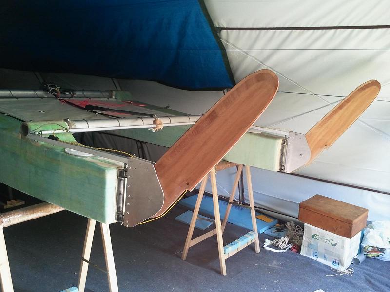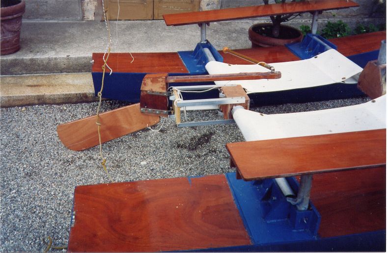 Quanto al centraggio: se hai visto le foto dei cat postate da Luca, le derive sono arretrate rispetto al centro velico, ma sono tenute tutte e due abbassate. Così la risultante dei due centri di deriva viene a trovarsi in mezzeria, come fosse una deriva centrale.