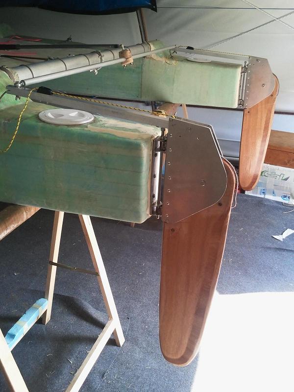 Le uniche lavorazioni affidate all’esterno sono: - il taglio a CNC delle piastre metalliche (in alluminio le 4 per la timoneria e inox le 2 della torretta alla base dell’albero) e delle pale dei timoni (compensato marino 18 mm). Questo per una maggiore precisione e specularità (e anche per fare prima  ). Ovviamente io ho fornito il file .dxf; - la saldatura delle tasche del trampolino (in PVC), dei rinforzi e l’inserimento degli occhielli (disegno e taglio sono miei); - la saldatura dei pezzi in alluminio (al Tig, di cui non dispongo) e dell’inox della torretta alla base dell’albero (sempre al Tig). I restanti pezzi inox li ho invece saldati io ad elettrodo (con l’inverter)