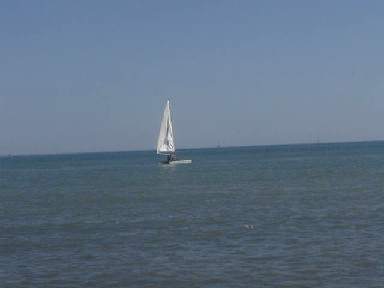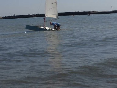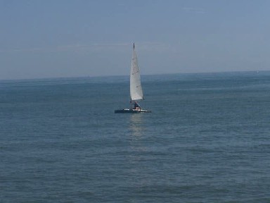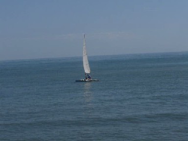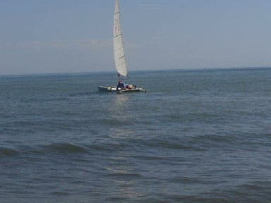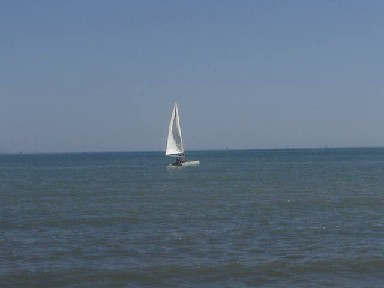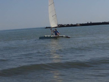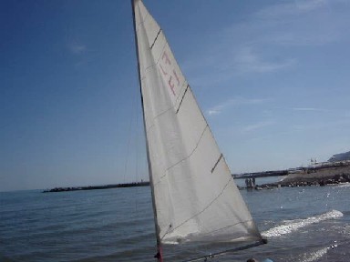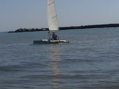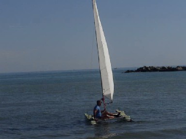 Nonostante la randa-mutanda, l’assenza di derive e di trasto (il carrello randa), ho preso il largo restando all’interno del corridoio di uscita perpendicolare alla spiaggia (30-35 mt di larghezza per 500 di lunghezza), stringendo e mantenendo (quindi senza eccessivo scarroccio) un angolo di poco maggiore (se non uguale) a quelli tenuti dal Flying Junior (della scuola di vela) e dal Classe A (di un socio del circolo velico) usciti poco dopo. Il maestro di vela mi ha poi confessato il suo stupore per la bolina che riusciva a fare quel catamar(i)no formato mignon