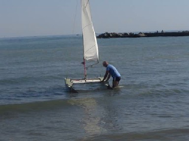 Eccomi, eccomi. Passata la perturbazione, ieri abbiamo fatto il primo bagnetto, anche se la giornata non era l’ideale causa assenza di vento (ma gli impegni, miei e degli assistenti, non lasciavano alternative se non aspettare il fine settimana… e l’inevitabile affollamento della spiaggia). Proprio l’assenza di vento (un paio nodi quasi costanti con qualche raffichetta a 3 o 4) ha posto in risalto i limiti del catamarano, soprattutto del Baby che naviga senza derive. Le problematiche della virata hanno quindi trovato sostanziale conferma, ma credo che, in quelle condizioni, anche i monoscafi, senza un fiocco da lasciare a collo, avrebbero avuto serie difficoltà. Infatti l’unica vela in vista era la mia. Ma andiamo per ordine.