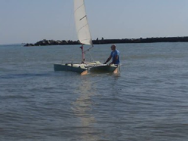 Bè, qui la previsione ha trovato piena conferma  I timoni comunque rispondono bene e la virata parte immediatamente, ma la barca poi si pianta prua al vento, e lì rimane. La randa, sporgendo di circa mezzo metro oltre i timoni (con la sua base di 70 cm più lunga rispetto a quella di progetto), arretra notevolmente il CV e rende la barca decisamente oziera. Appena si crea un po’ di pressione, senza velocità, credo sia quindi naturale che le prue ritornino al vento. Sicuramente un fiocchetto avrebbe aiutato parecchio. Anche la mia inesperienza, in materia di catamarani, ha giocato abbastanza negativamente. Comunque le derive credo siano quasi indispensabili. Vedremo alle prossime uscite con più vento (e quindi più abbrivio).