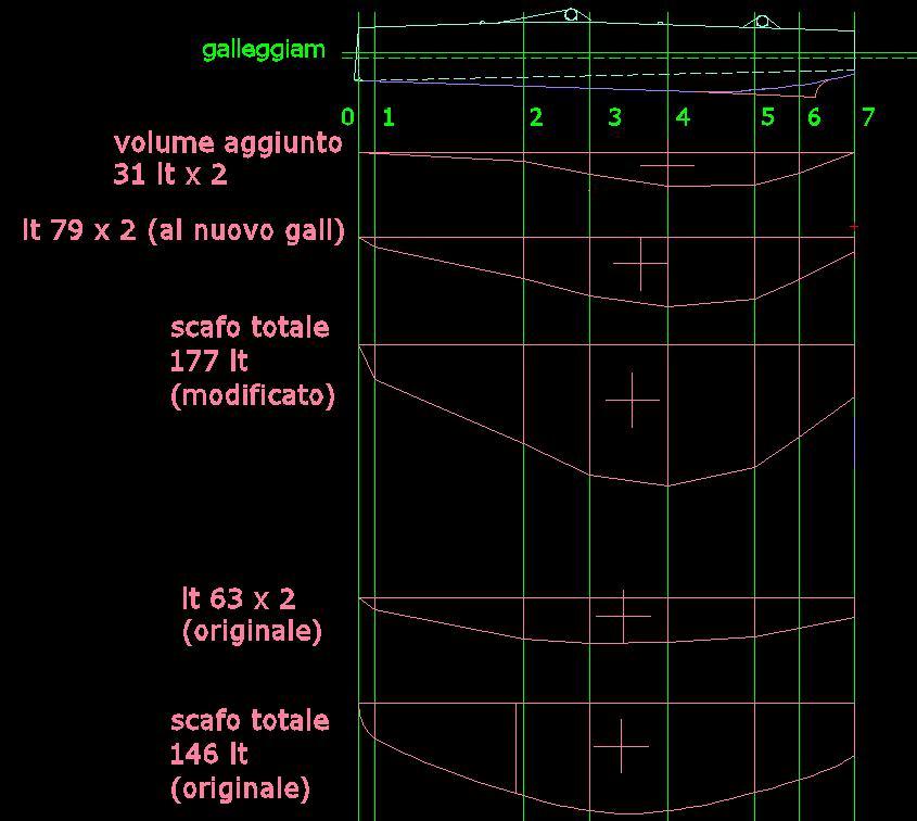 Le curve di carena sono queste, ma nel sagomare il foam aggiunto (che, per circa 2/3 della lunghezza, ha una sezione di carena rotonda) sono stato leggermente più abbondante rispetto alle sezioni di progetto (quindi ci saranno un paio di litri in più). La riga verde continua che corre a metà scafo è il galleggiamento originario (amas ad uso cat), mentre quella verde tratteggiata è (o dovrebbe essere) il nuovo galleggiamemento (amas originario + volume aggiunto). Sono circa 3 cm di differenza (Per la verità la differenza sarebbe maggiore perché il gallegiam originario era stato calcolato per un peso complessivo di 126 Kg, mentre per quello nuovo il peso è stato elevato a 158, quindi più aderente alla realtà).