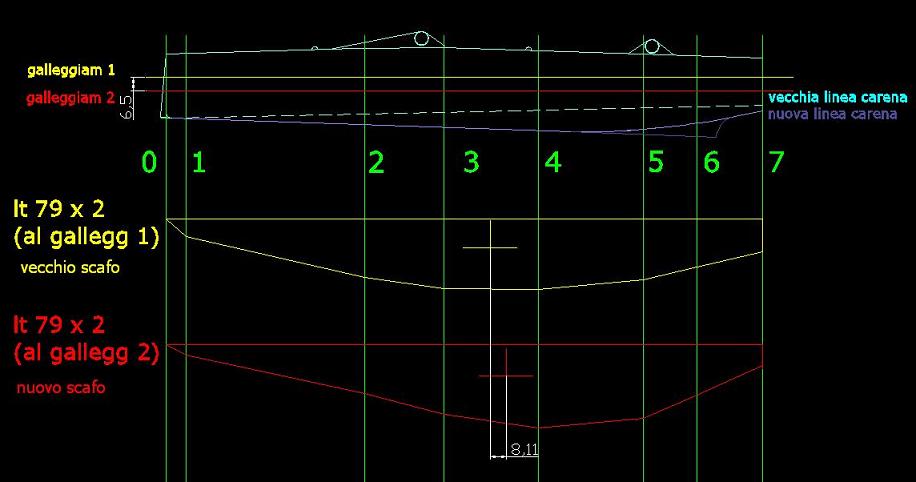 - il centro di carena (CC) arretra di 8,11 cm - la linea di galleggiamento si abbassa di 6,5 cm