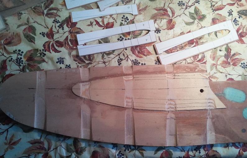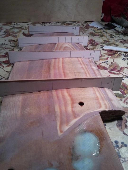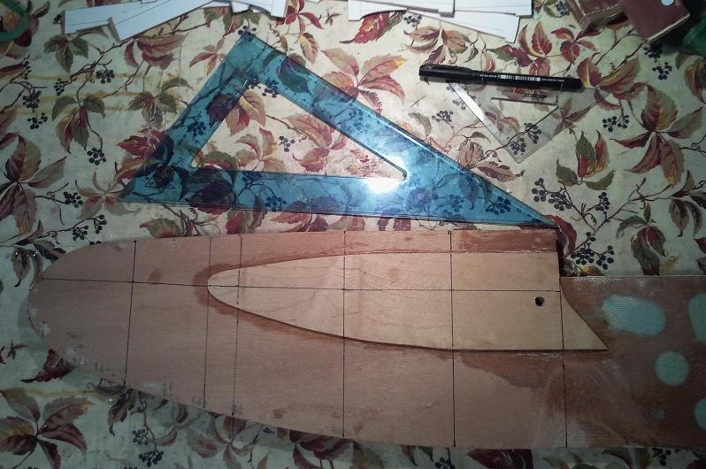 Con avanzi di compensato marino da 3 mm ho preparato delle dime (dx e sx che abbracciano tutto il perimetro a distanze regolari), con cui ho realizzato le tracce di riferimento su entrambi i lati della pala (così vengono speculari).