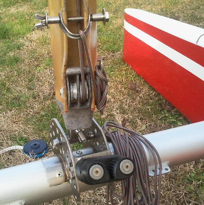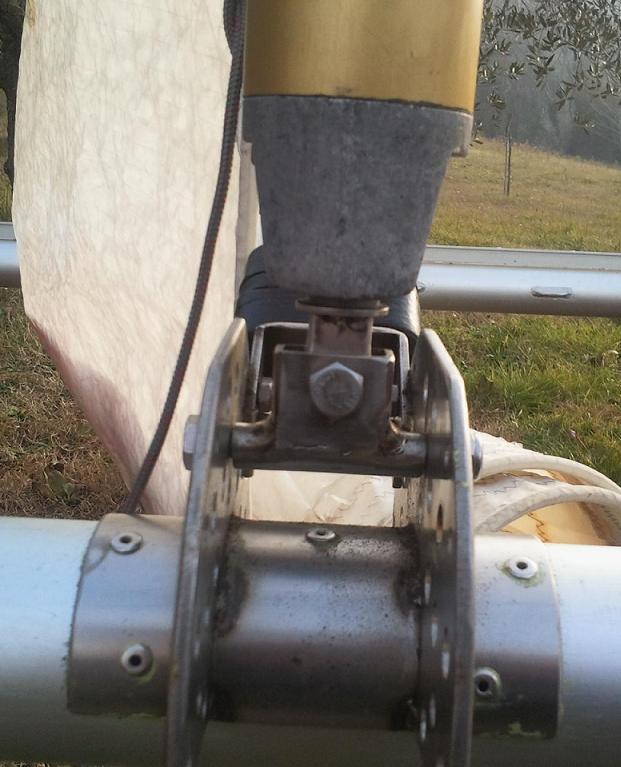 Quello precedente (che compare anche nel video di pag. 11) consentiva l’inclinazione dell’albero in senso longitudinale (prua/poppa), ed era invece rigido (cioè creava un incastro) nell’inclinazione laterale (dx/sx). Il piede degli alberi rotanti dovrebbe invece agganciarsi ad una sfera che gli consente di inclinarsi su 360° (tipo il sistema uniball). Questo perché (almeno così mi pare logico) l’albero sotto spinta laterale (es. di bolina) non resta in posizione perfettamente verticale (rispetto all’asse trasversale della barca) come a terra, ma si inclina sempre un pochino (causa allungamento del sartiame, elasticità dello scafo e dello stesso albero). Questo succede in tutte le barche e si nota con l’allentamento (entro certi limiti di tolleranza) delle sartie sottovento. Lo snodo alla base è quindi necessario affinché non si creino disallineamenti e resistenze nel meccanismo di rotazione (anche se l’albero si inclina rispetto allo scafo, resta invece il più dritto possibile sul suo asse di rotazione).