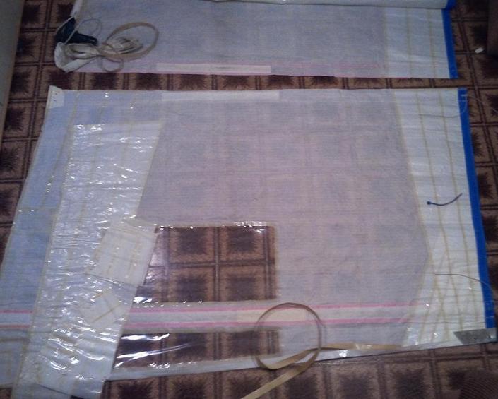 Iniziato lo smontaggio dei pannelli inferiori della randa. Così posso recuperare tutti i pezzi per ricostruire le due nuove bugne di mura e di scotta (oltre ad imparare bene come è fatta una randa). Per ora l’unica cosa che ho tagliato è stato il filo delle cuciture e il tessuto intorno all’occhiello della bugna di mura. Mi avanzerà anche del materiale più che sufficiente per un bel fiocchetto che farà “pendant”.