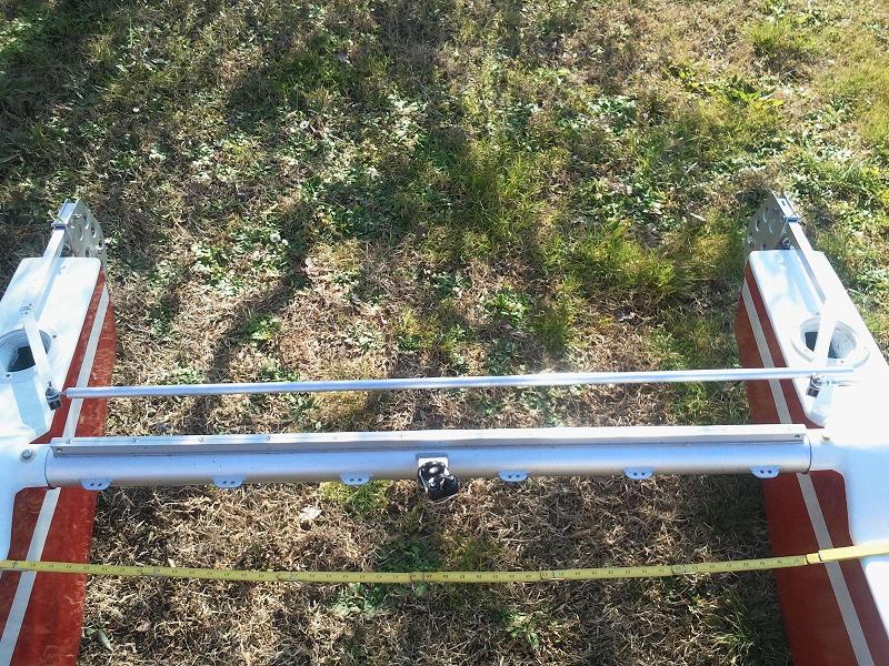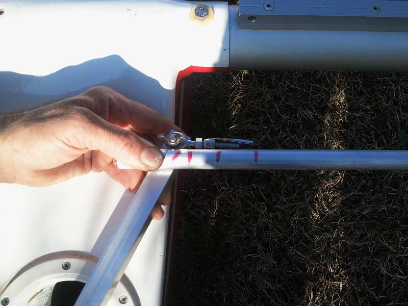Albero e sartiame ok. L’ho accorciato a 642 cm, che però vanno maggiorati di circa 10 cm dalla traversa per piede, snodo e torretta. Direi forse anche troppo, ma ad accorciare si fa sempre in tempo. Ho riutilizzato le sartie precedenti con l’aggiunta di 4 briglie mobili di prolunga dello stesso materiale (dyneema scalzato da 3 mm, carico di rottura 750 Kg). Con i bulloni che stringono nel punto di giuntura, l’albero sembra abbastanza rigido (come quello precedente), per cui credo di poter evitare il diamante. Molto probabilmente potrò usare il vecchio boma senza necessità di allungarlo