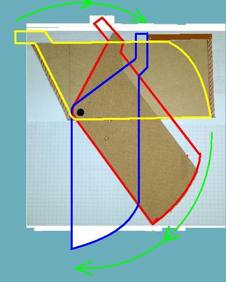 Se non eri così frettoloso e tagliavi la lama come ti avevo indicato (linea gialla), ora avresti una deriva che si apriva completamente (linea blu), più profonda e che sfruttava il massimo ingombro della cassa (ossia più larga)