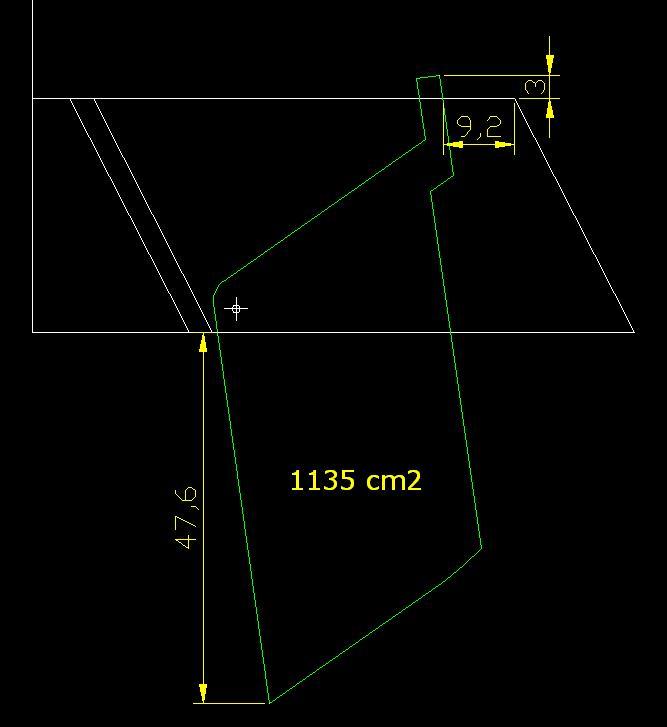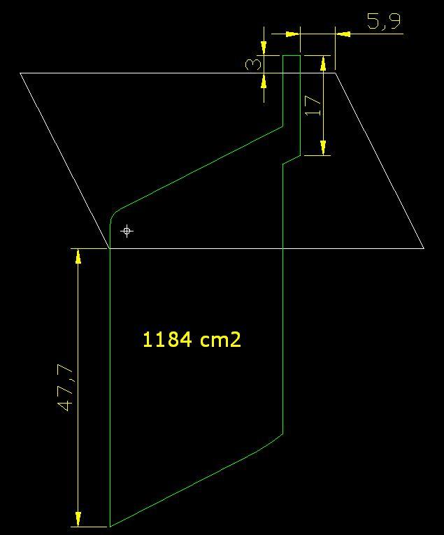 Questo disegno sfrutta al massimo lo spazio a disposizione nel pozzetto, e come si vede sono riuscito ad ottenere una fuoriuscita di quasi 46 cm con deriva larga 30 cm. Quindi molto meglio del primo modello.