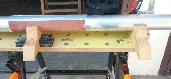 Ottenuto un tampone sagomato fissando un pezzo di carta vetrata ad una delle traverse, e fissato uno dei supporti per mantenere l'allineamento con il piano, ho carteggiato finché la traversa con la carta vetrata scorreva bene. Poi ho carteggiato tutte le facce e arrotondato un po' gli spigoli. |