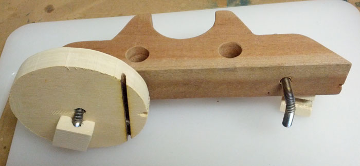 2) Simulazione fissaggio vista da sotto. Il quadrello di legno sotto il compensato, una volta annegato tutto nella resina, impedisce la rotazione del prigioniero sotto lo sforzo del fissaggio con i dadi.