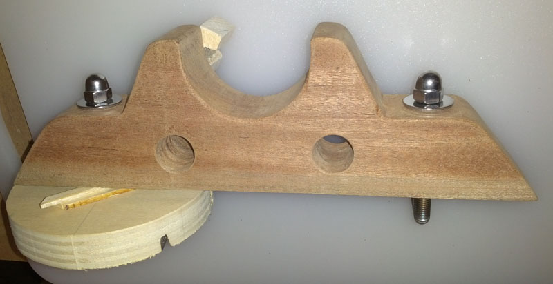 In questa foto sono ben evidenti i 3 fori sul supporto: - Nel foro centrale cieco è infilato un tubo di alluminio che arriva al supporto sulla mura opposta. Il tubo serve per contrastare la forza a stringere dei legacci. - I due fori passanti servono al passaggio degli elastici o delle cime che utilizzerò per legare le traverse.
