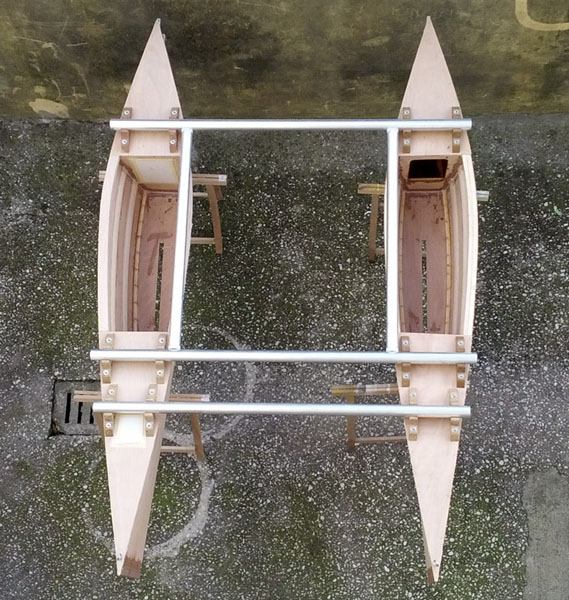 M'era venuto in mente anche un'idea balzana: mettere delle prolunghe di mezzo metro alle traverse, e fare due panchette esterne agli scafi, da usare quando c'è un forte sbandamento.
