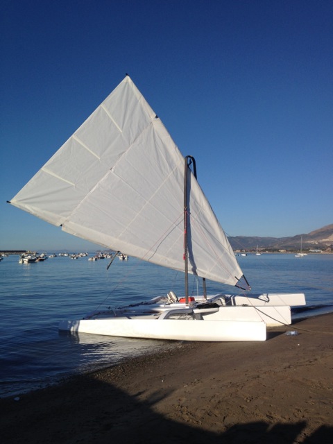 Complice il bel tempo, stamattina ho armato per la prima volta il mio treXL, ovviamente tutto con cime provvisorie. In questo modo sono riuscito a calcolare le misure dei cavi in acciaio dello strallo e delle sartie, oltre l'altezza del bozzello della drizza e del golfare per il fissaggio del bompresso allo scafo.