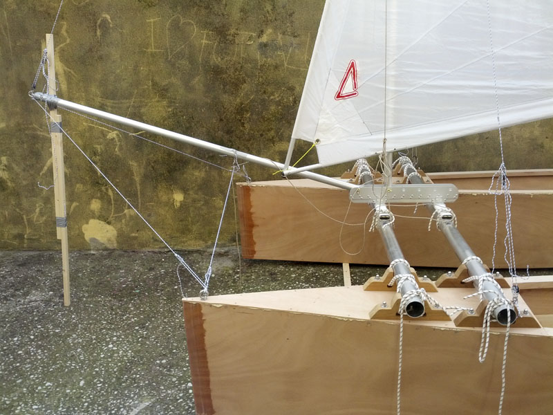Nella seconda foto si vede che il bompresso ha quattro cime, due fissate alla varea, e due ad un golfare sulla verticale delle prue degli scafi. All'inizio avevo messo solo le due anteriori, ma mi sono reso conto che con un bompresso così lungo, c'era troppa flessione. Allora ho aggiunto le due centrali. Le definitive, saranno in dyneema quelle anteriori, e in acciaio quelle centrali.