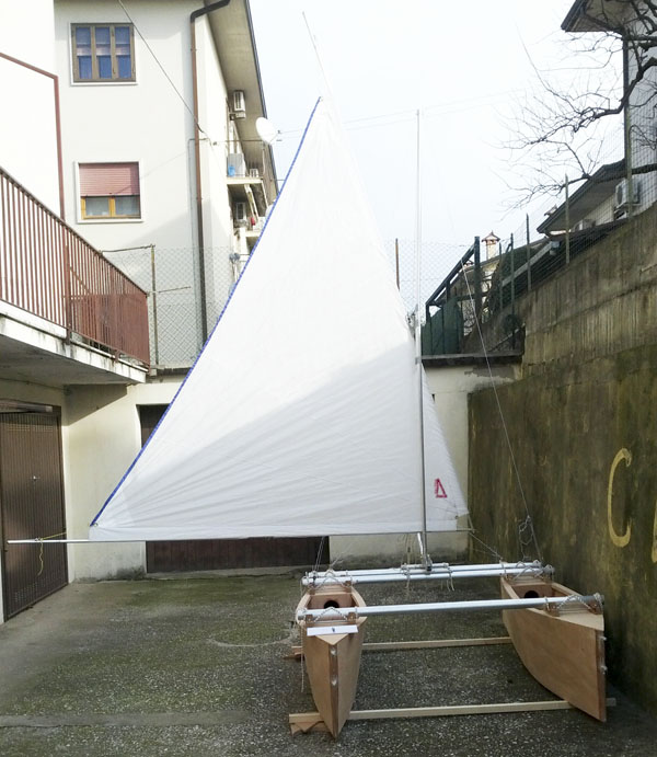Qui chiedo un consiglio: la vela latina è di 5,2 mq, ed è oltretutto meno efficiente della randa Marconi. Avrei quindi pensato di aggiungere un fiocco. Se lo faccio in modo che non si intralci con la randa, ottengo un fiocco di circa 1 mq. Se lo faccio più ampio, tipo genoa, posso aggiungere almeno un altro 1/2 mq, però ho paura che quando eseguo una virata possa incattivirsi sull'angolo di mura della randa.