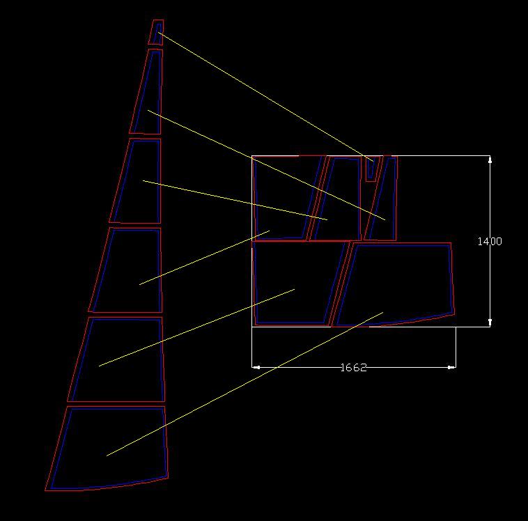 Mi sembra che il Lankotex 150 gr/mq, 4x3m costi € 22,57 (€ 40 ne costa la pezza da 6x4) Per un fiocco da 1 mq, acquistare 3 ml di Dacron (che sviluppano 4 mq) mi sembra decisamente esagerato. Per fare il fiocco del Gorillino (mq. 1,45 da Sailcut) ho dimensionato i pannelli di altezza pari alla metà del rotolo di Dacron (h. 140/2 = 70), poi li ho trasferiti su AutoCad cercando la composizione che producesse meno scarto possibile, mantenendo però l’orientamento per il taglio Cross Cut (il migliore per vele in Dacron), ossia con l’ordito del tessuto perpendicolare alla balumina. Come vedete ci è voluto un pezzo da 140 x 163 cm (mq. 2,28), che mi è bastato anche per ricavare tutti i rinforzi delle bugne.
