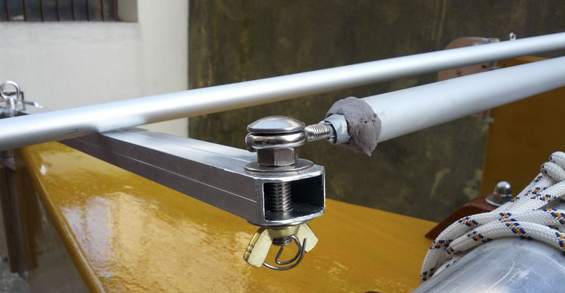 Ho preso spunto dal metodo utilizzato da Luca, utilizzando un bel bullone a testa arrotondata e il galletto sotto, così dovrebbero esserci meno intralci per la scotta (che comunque si incattivirà sicuramente lo stesso. ).