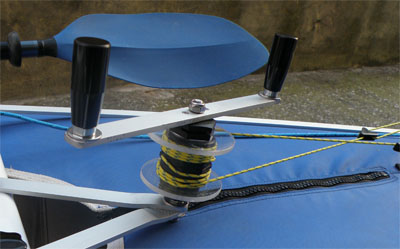 Poiché sulla canoa non c'è posto per una barra del timone lunga, ho costruito una riduzione ad ingranaggi (quelli in alluminio con cinghia dentata) e barra del timone cortissima che, tramite i due ingranaggi, muove tutto il meccanismo. - Il pignone, la ruota in alluminio e la cinghia dentata li ho acquistati. - Gli ingranaggi in legno li ho costruiti disegnandoli grazie ad un ottimo programma scaricato da internet (costa poco...) su http://woodgears.ca , bellissimo sito per lavori meccanici in legno!. - La struttura di supporto in alluminio è anch'essa completamente autocostruita (come quella del timone che, se si guarda bene, è anche sganciabile e sollevabile).