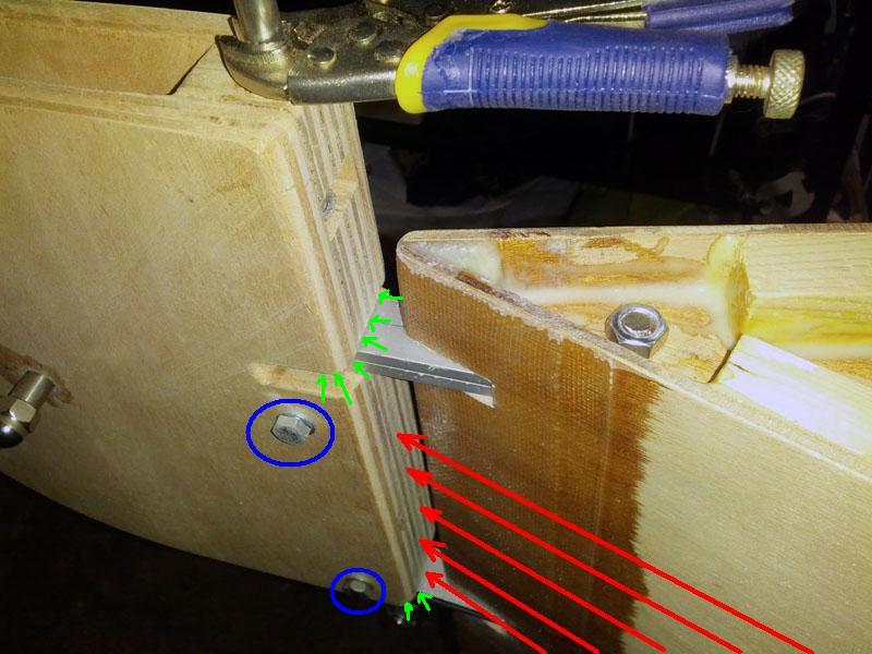 Sono di piatto nel legno, vero, ma più internamente sono fissate con un bullone passante fra i due triangoli di legno (per la lama sotto nella foto mancano ancora), e il tutto verrà poi annegato nella resina caricata con fibra. Praticamente un blocco unico con le due fiancate. |